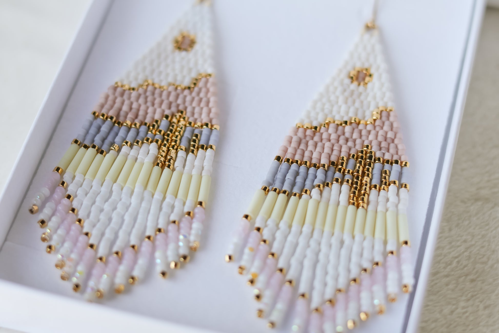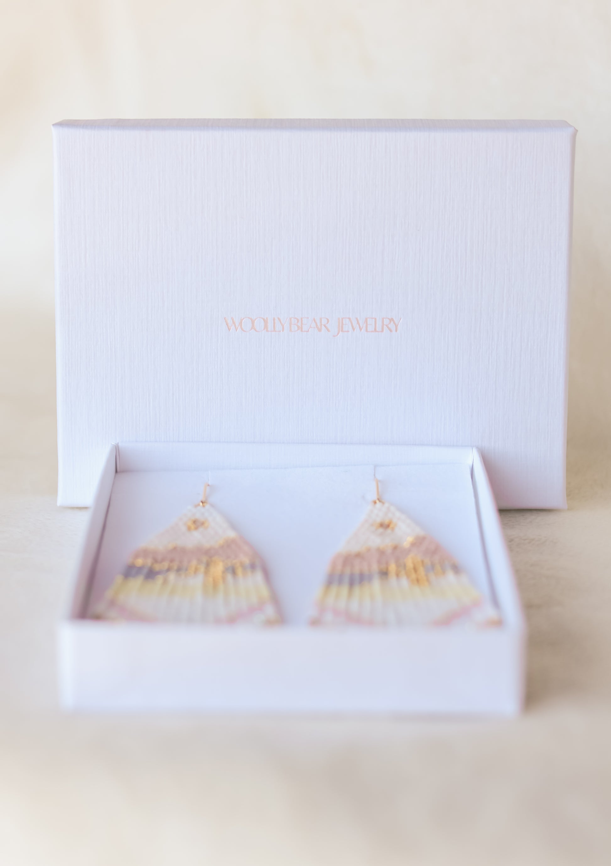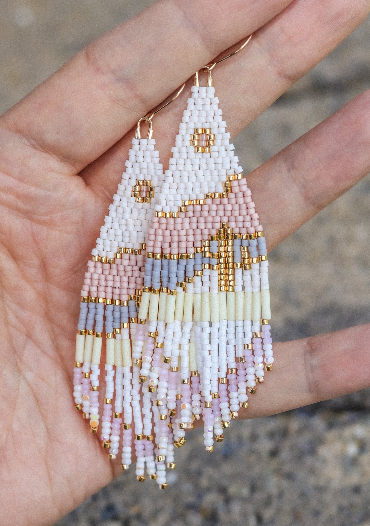 Bring the beauty of desert horizons to your jewelry collection. These handwoven earrings feature a dreamy layered cake design crafted with creamy soft pastel hues and accented with 24k plated golden beads.