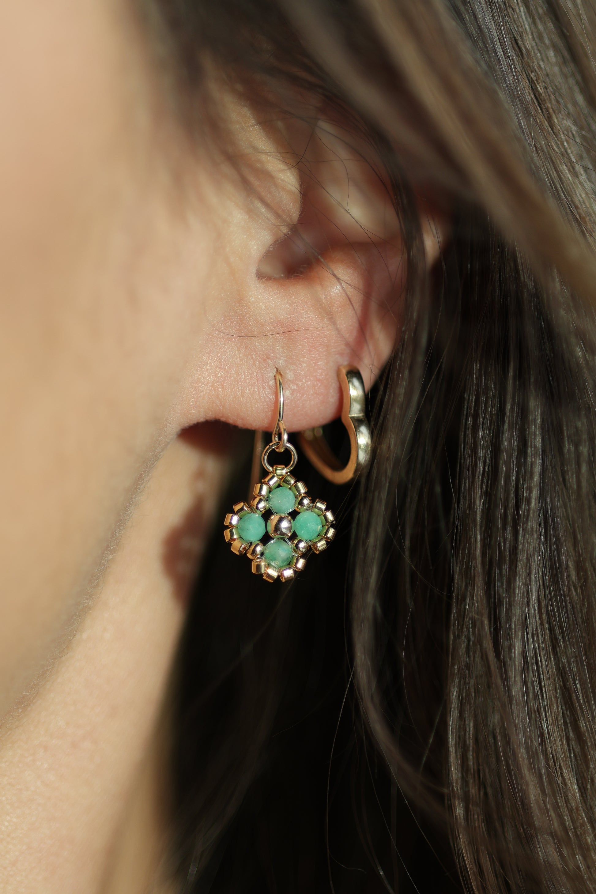 Handwoven clovers crafted with 4mm gemstones and framed in 24k gold-plated Miyuki + Czech beads. Finished with 14k gold-filled classic hooks and a gold-filled centre bead for a soft, luminous glow that feels both timeless and modern.