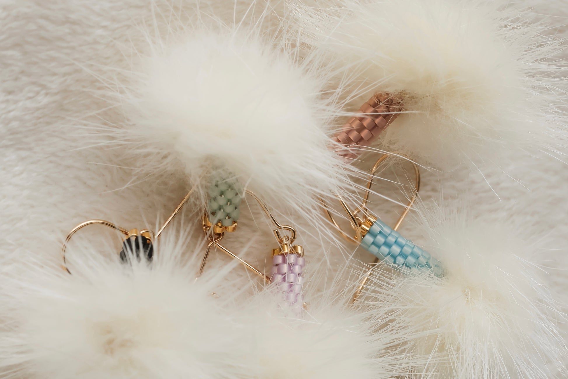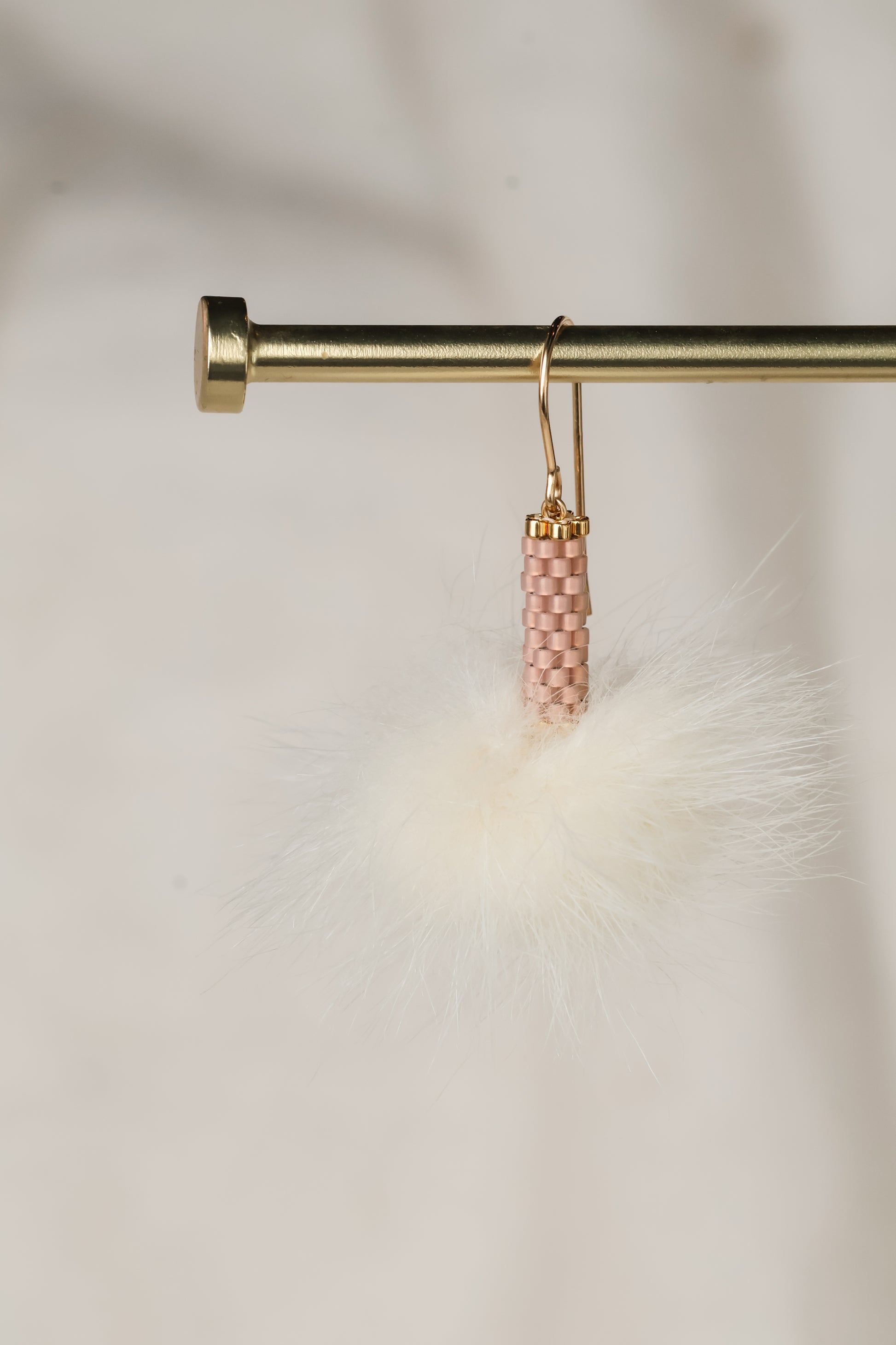 The Woolly Mink Plumes feature a 30 mm cream mink pom, softly floating beneath a handwoven Miyuki glass bead cylinder — each accented with 24 karat gold-plated glass beads and finished with 14 karat gold-filled findings. Measuring approximately 1.5 inches in drop, these earrings are the definition of featherlight luxury.